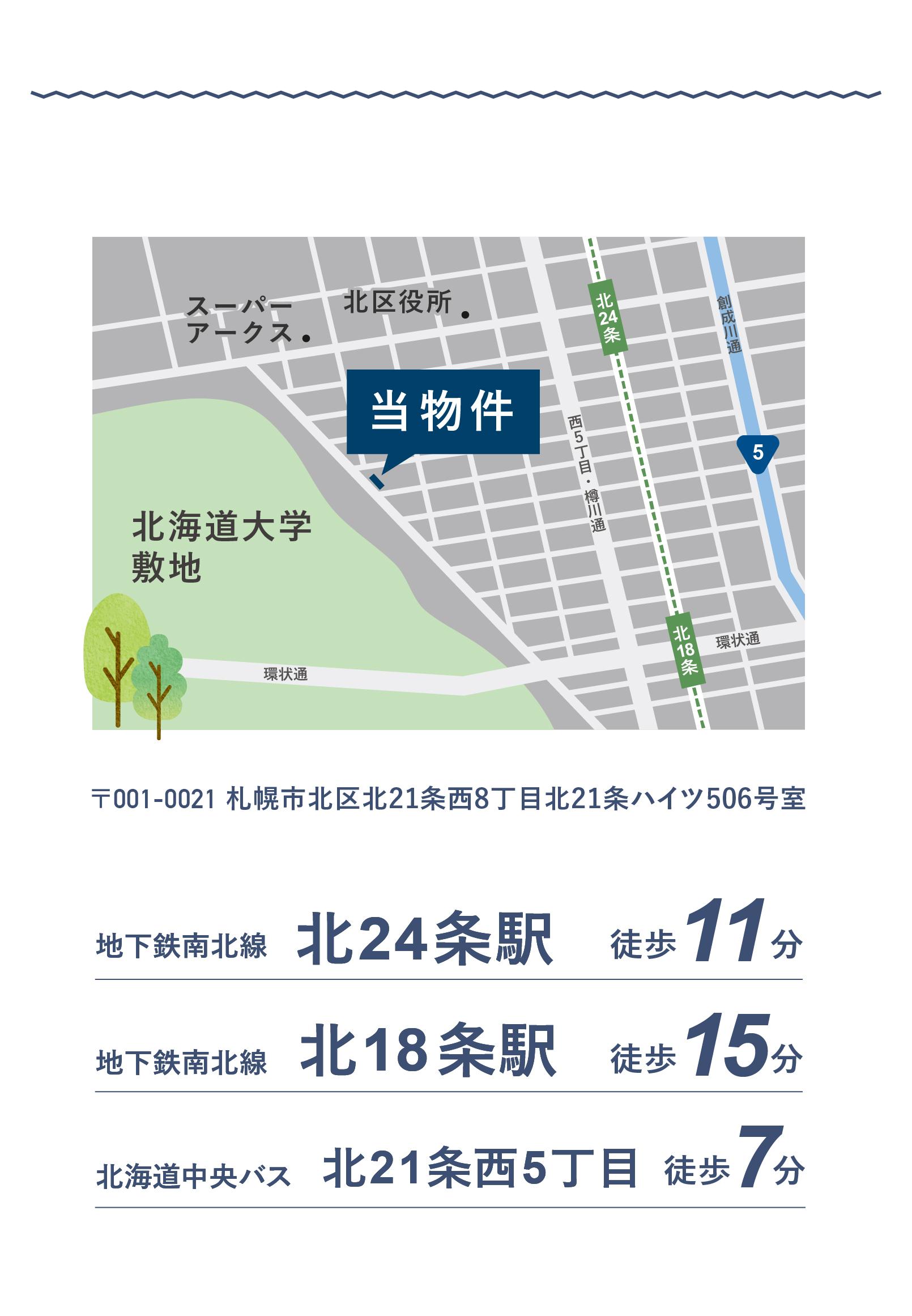 札幌市北区北21条西8丁目2−20 北21条ハイツ506号室 (googlemap) |