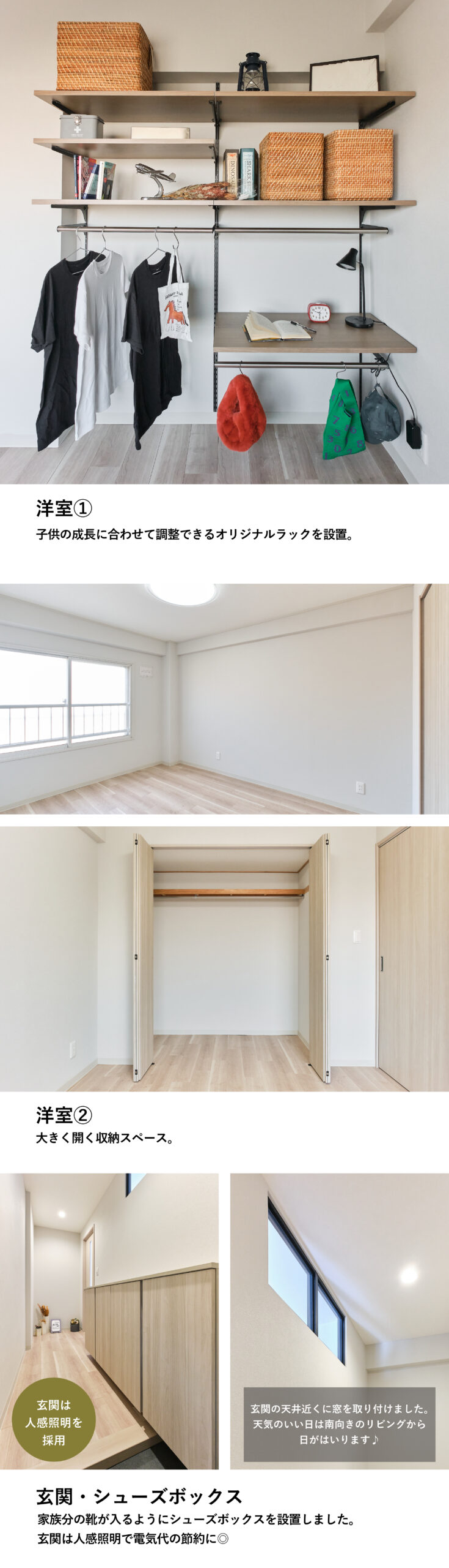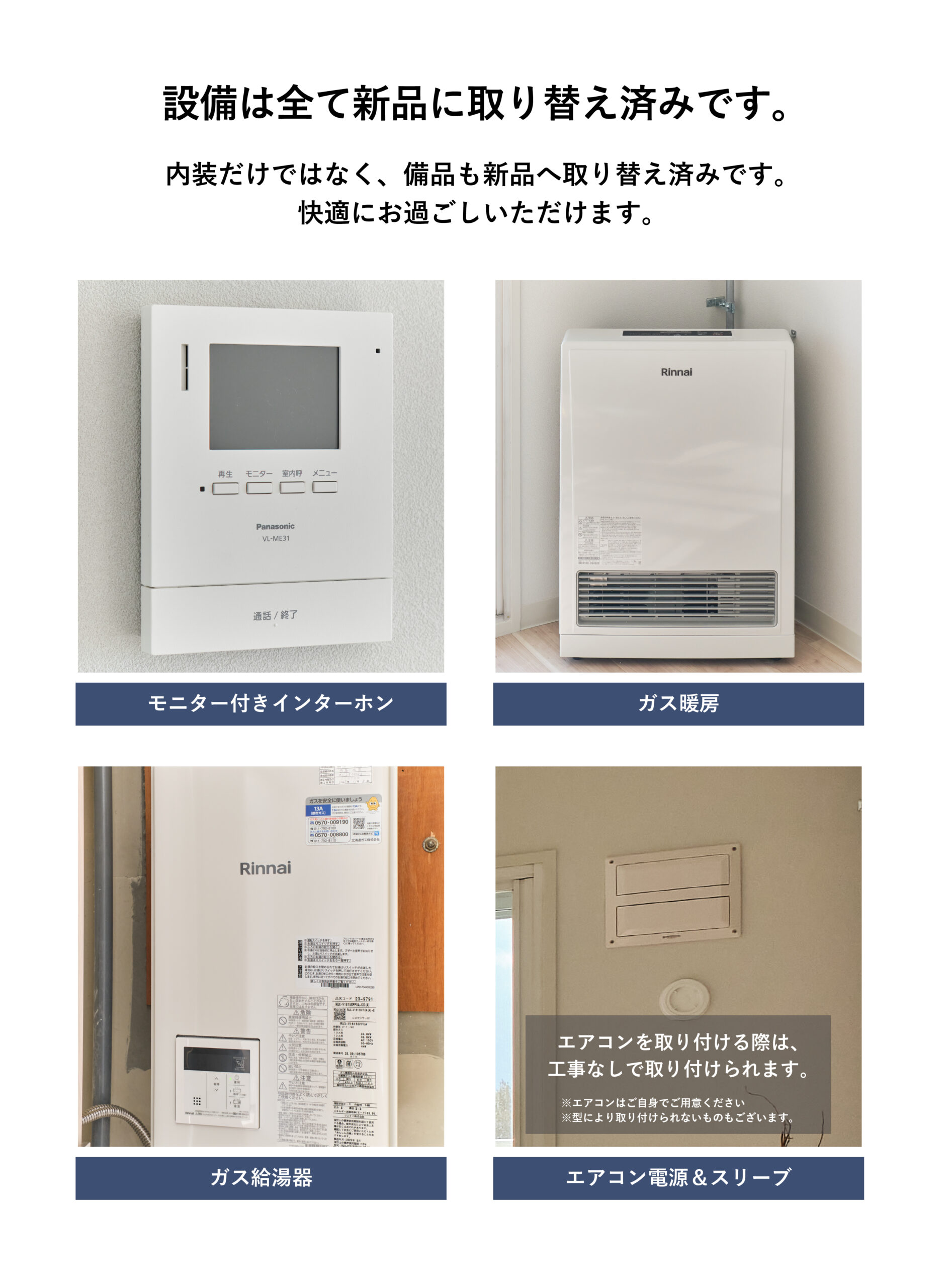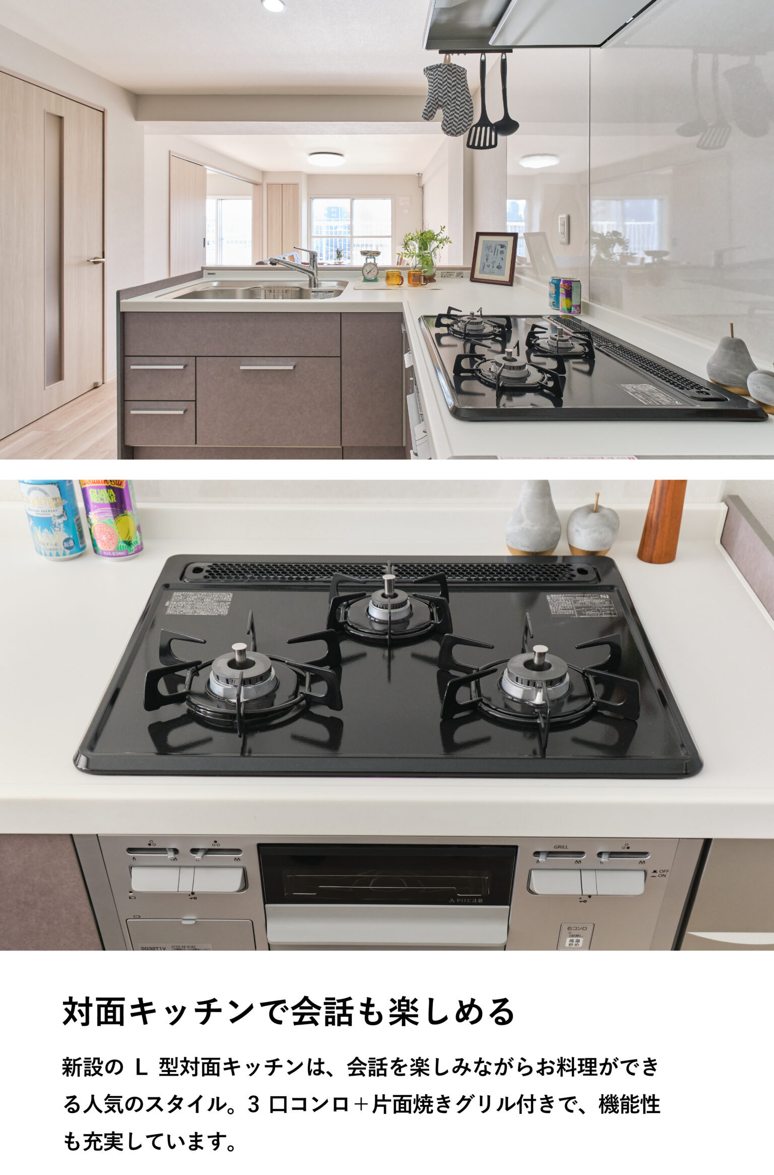| 主なリフォーム内容 | ◇L型対面キッチン新設、3口コンロ+片面焼きグリル付 ◇ユニットバス1416新設、洗面・トイレ新品交換 ◇ガス給湯器・ガスFF暖房新品交換 ◇全室フローリング床新設、大容量シューズ収納+室内窓 ◇大きく開放できるリビング続きの洋室3枚引戸 ◇エアコン用配管穴+100V電源設置 |