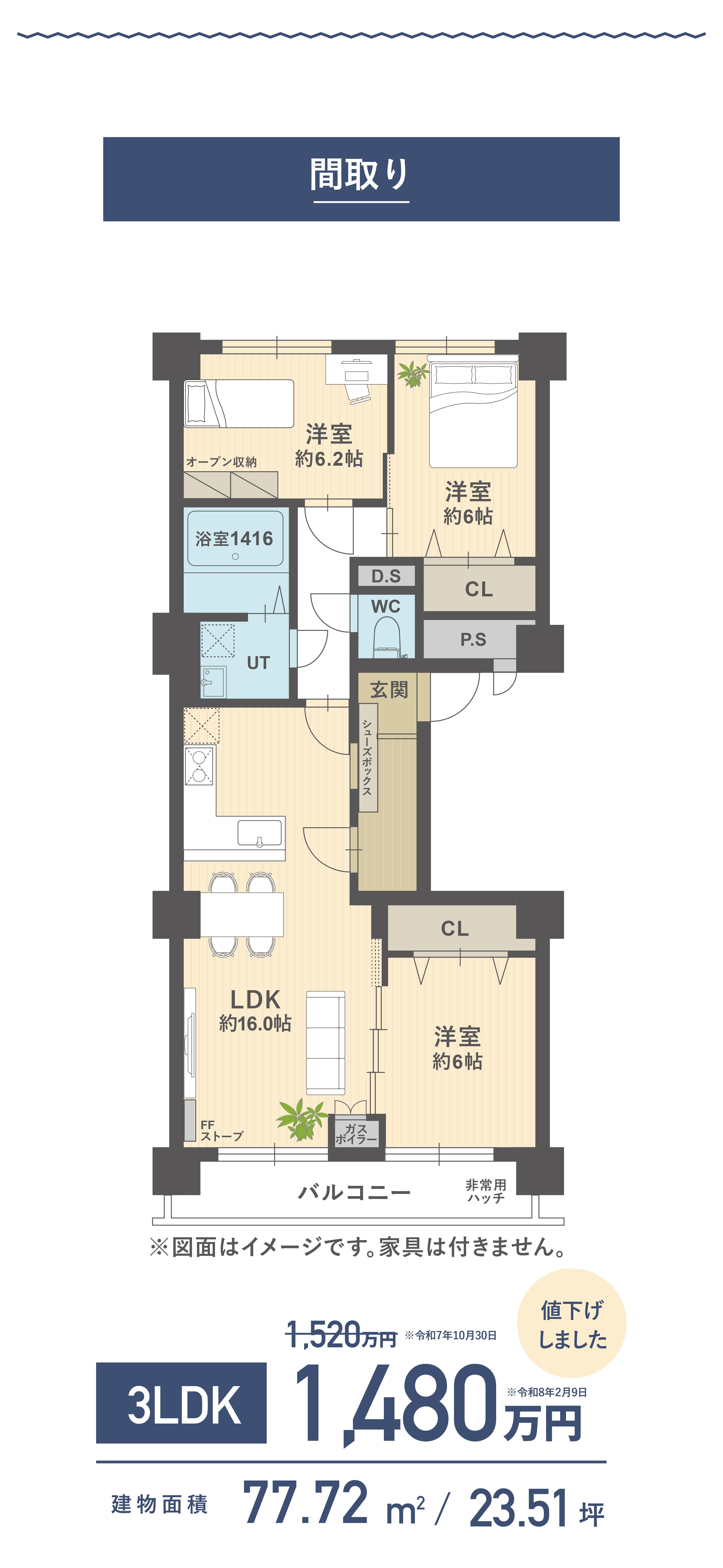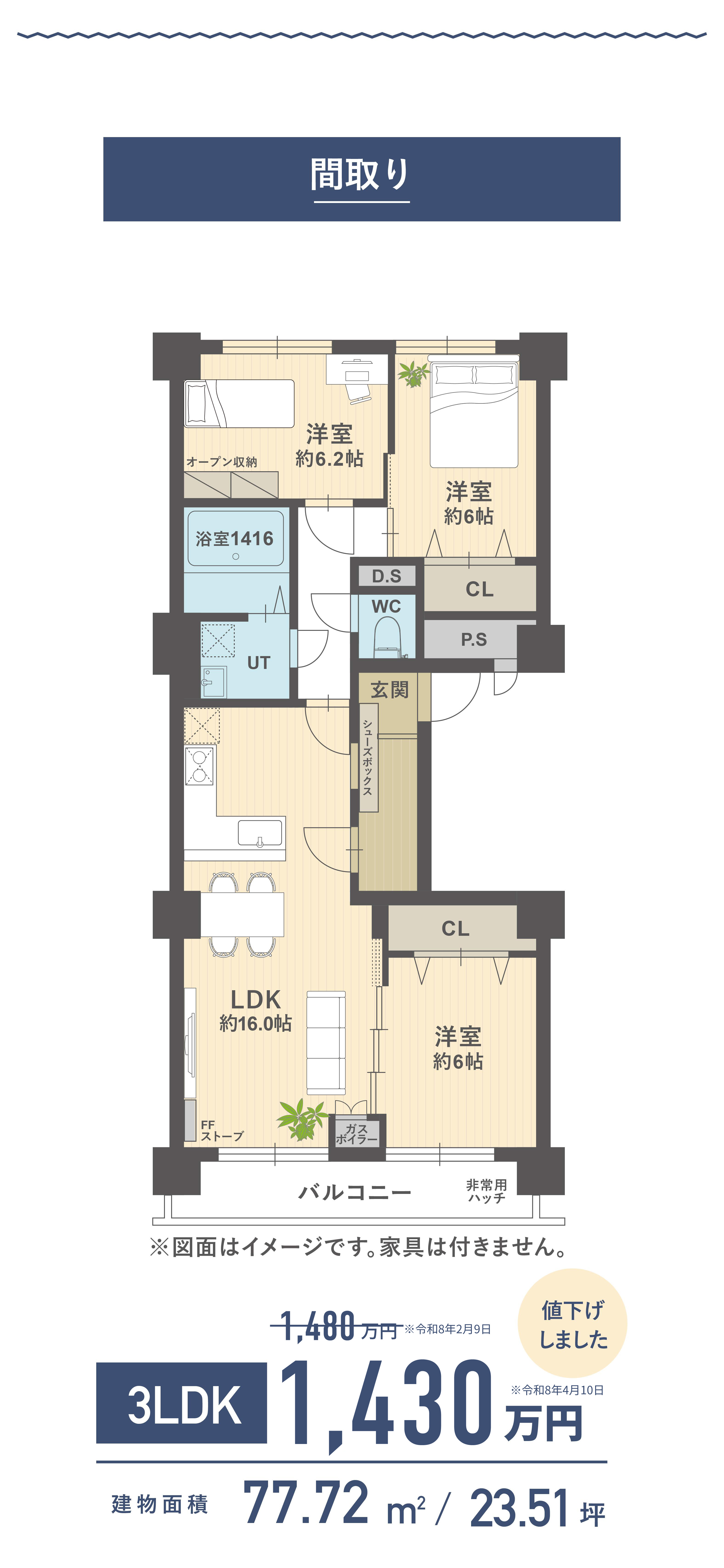 | 専有面積 | 壁芯 77.72㎡(バルコニー面積 7.56㎡) |